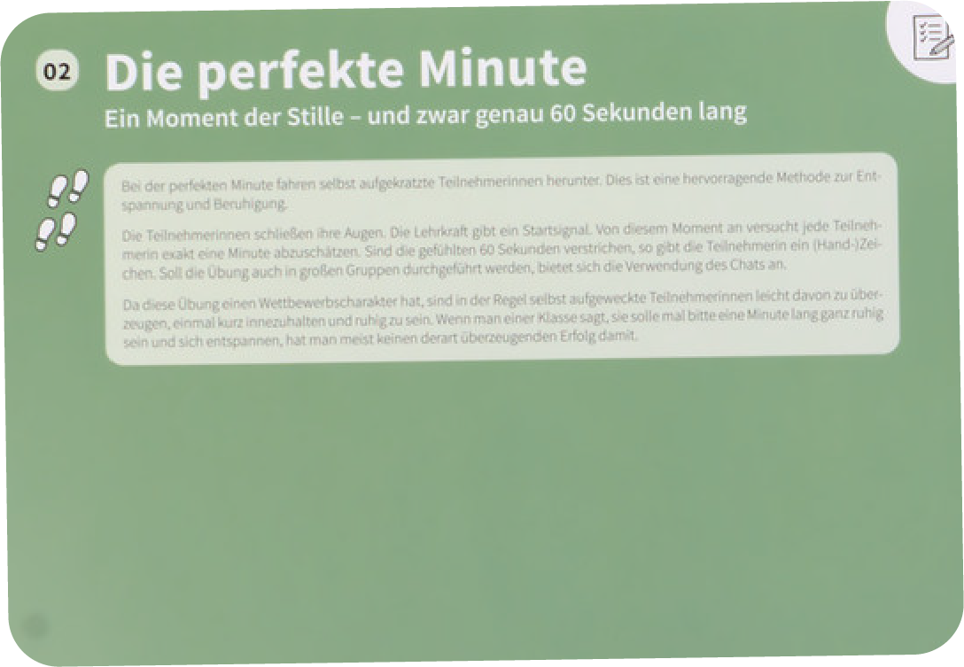 Alle Methoden unseres Kartensets sind vielfach praxiserprobt und erfordern minimalen Aufwand in der Vorbereitung und Durchführung. Ihre Veranstaltungen profitieren von erhöhter Aufmerksamkeit und größerem Engagement Ihrer Teilnehmenden, während Sie ein Umfeld schaffen, das der für Online-Settings inhärenten Bewegungsarmut und Distanz entgegenwirkt.
