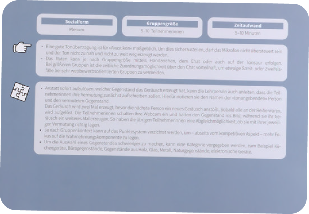 Beobachten Sie als Lehr- und Leitungsperson auch immer wieder Passivität und Resonanzarmut bei Ihren Teilnehmenden? Kennen Sie das Gefühl, dass eine Online-Veranstaltung eine Herausforderung für die Konzentration aller darstellt? Möchten Sie wirksam gegen die Anonymität und Unverbindlichkeit angehen? Dann nutzen Sie unsere Webigizer – ein Kartenset mit 50 aktivierenden Methoden. Konzipiert, um jede Online-Veranstaltung – sei es ein Seminar, ein Meeting oder eine Konferenz – lebendig und beziehungsintensiver zu gestalten.